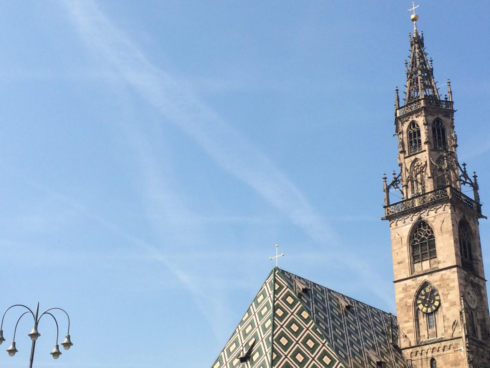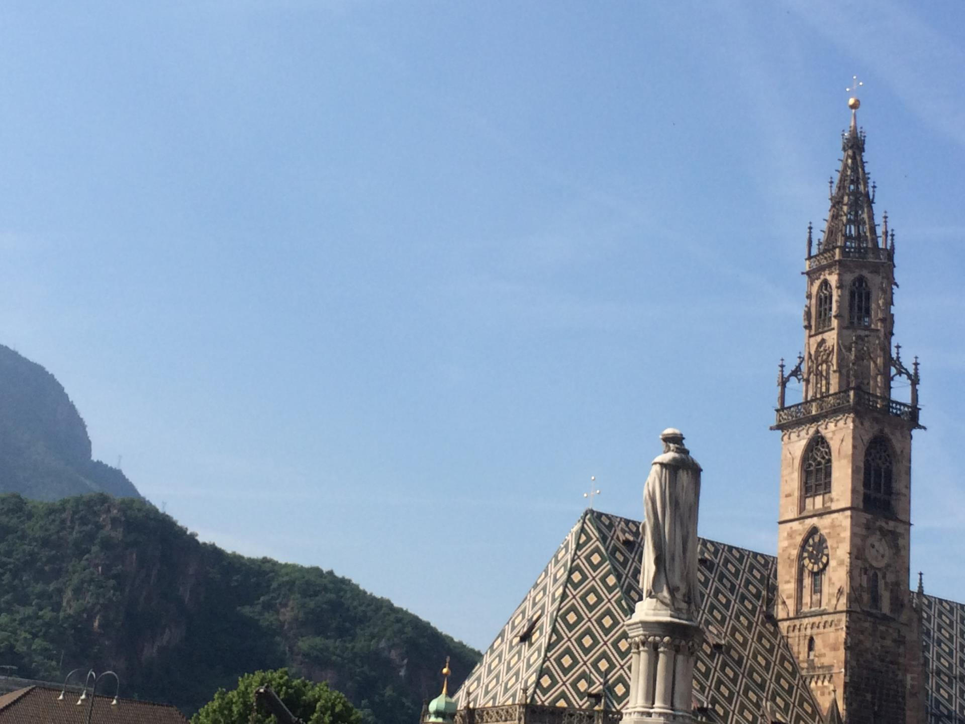 The Bozner Dom rises up against a backdrop of green mountains and blue sky, giving the impression of reaching upwards, imposing and yet filigree. All eyes are drawn to it, along with the slight figure of the statue of the minnesinger, Walther von der Vogelweide, who gives his name the popular square, scene of Bozen's most famous events, from the 'Speckfest' to the Christmas market. He really seems to be staring at Bozen's most famous church – and so let's just say a quick hello to him before exploring the art, history and history of art of the cathedral also known as Maria Himmelfahrt. From here it's on to Dominikanerplatz, where you should have at least a look at the gothic paintings in the cloister and the church. After let's go past the Free University of Bozen-Bolzano, and off left to the famous Talfer Bridge, which will tell us its history. Or rather, it is the Talfer river itself flowing beneath the bridge that recounts its journey as it murmurs and splashes on its way. Cars, motorbikes, throngs of people pass over it, all going in the direction of the Victory Monument, which has a few stories to tell and in the basements explains some of the things witnessed earlier today.